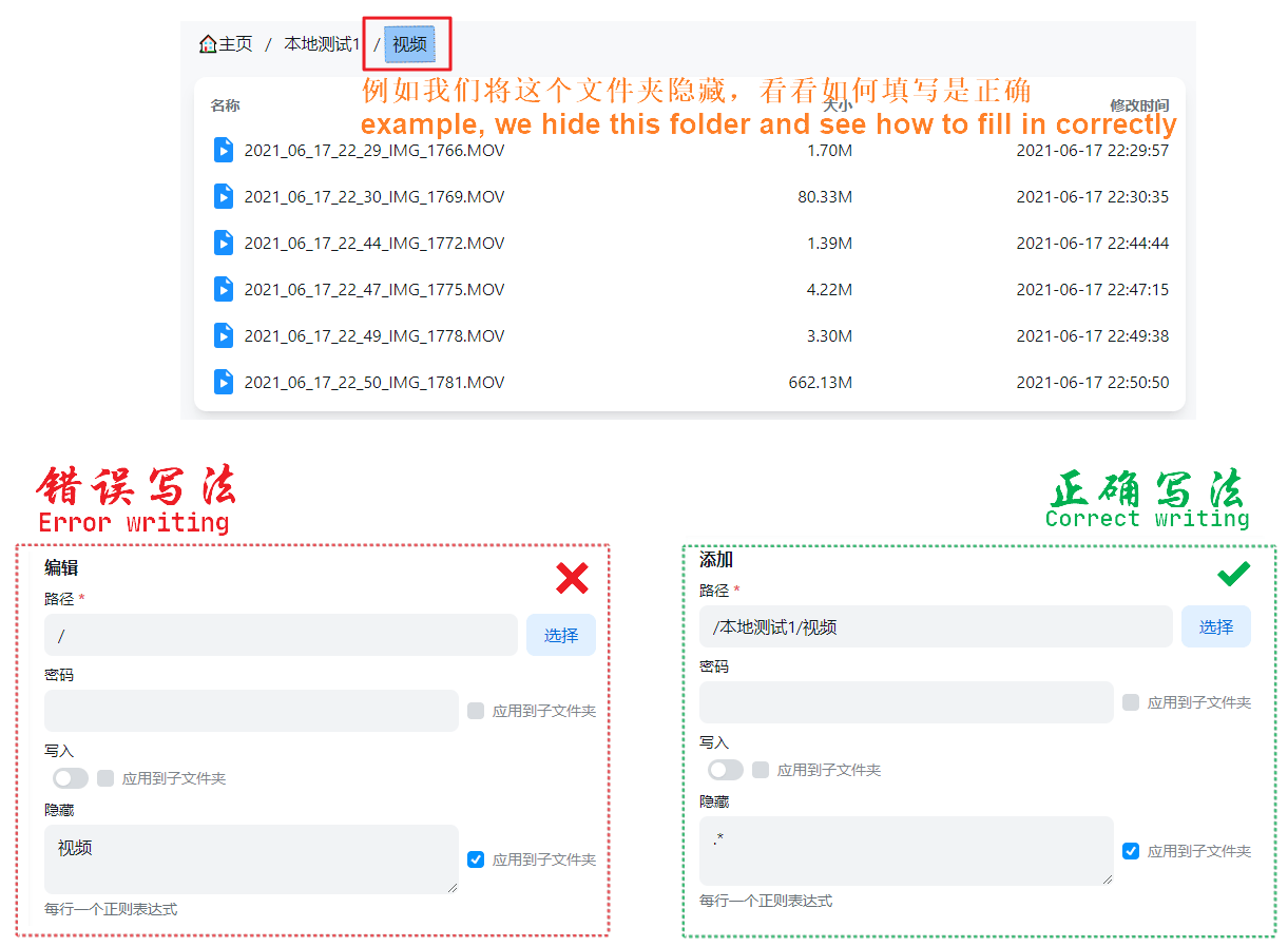 ❌ You cannot directly fill in the meta information of the root directory /, and then fill in the folder we want to hide, the error case View details