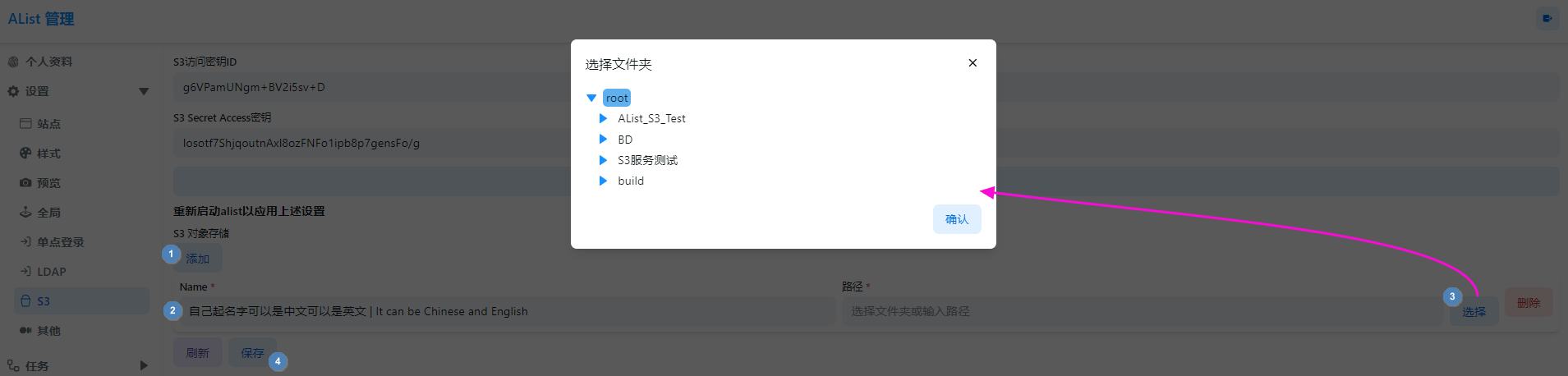 }1.3 前两步操作完成后 启动AList,继续进入后台S3配置页面,选择自己想将某路径映射为对象存储存储桶