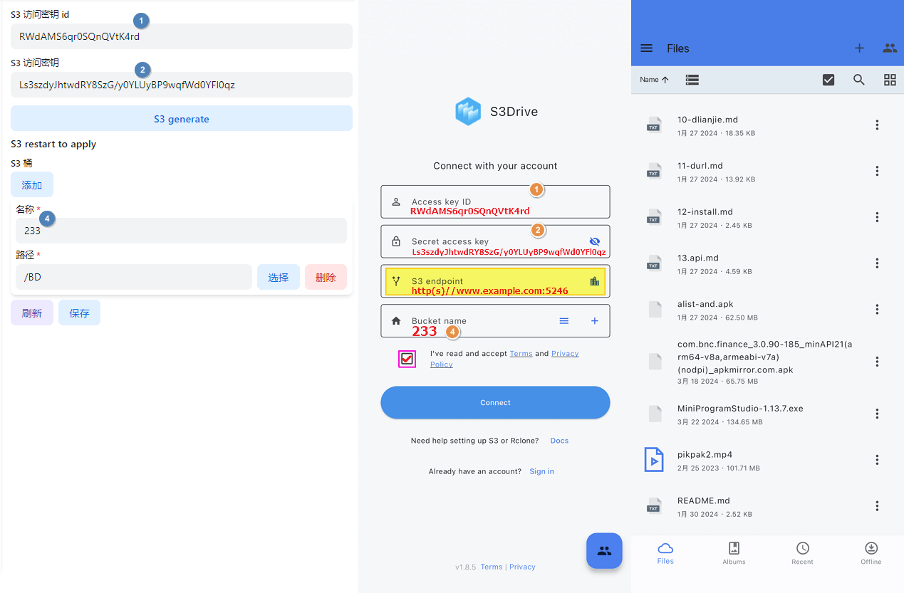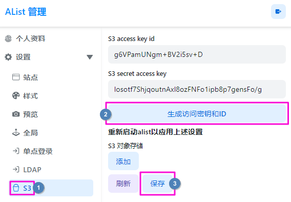1.1 如果是第一次使用,先打开AList后台生成一下 访问客户端ID 和 访问秘钥 保存,然后停止AList,打开配置文件启用S3服务