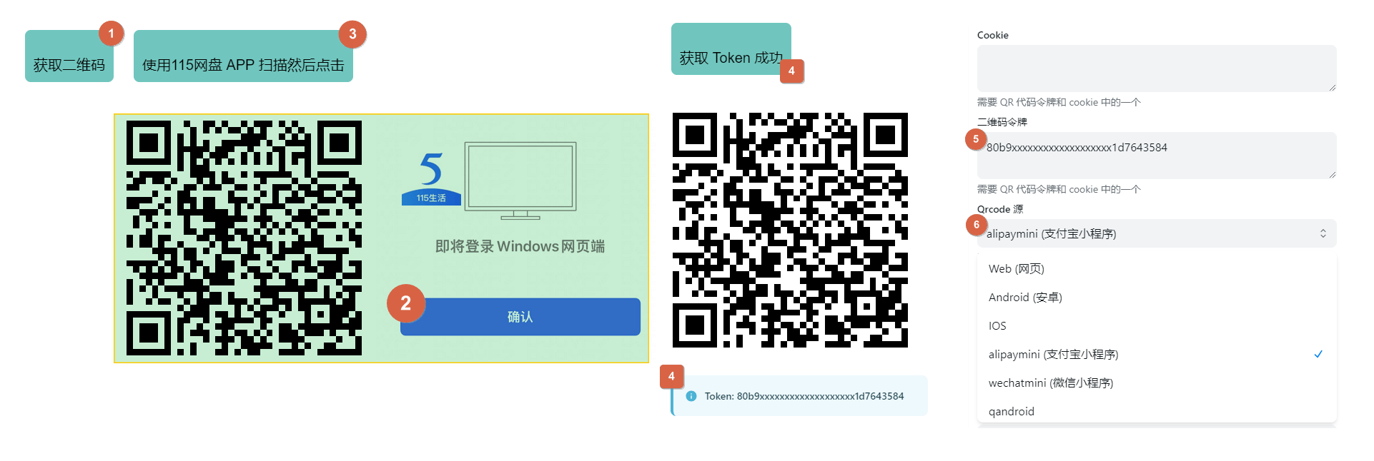 使用115网盘 APP 扫描然后点击按钮,获取 Token - 将获取到的 Token 添加到 AList 115驱动的