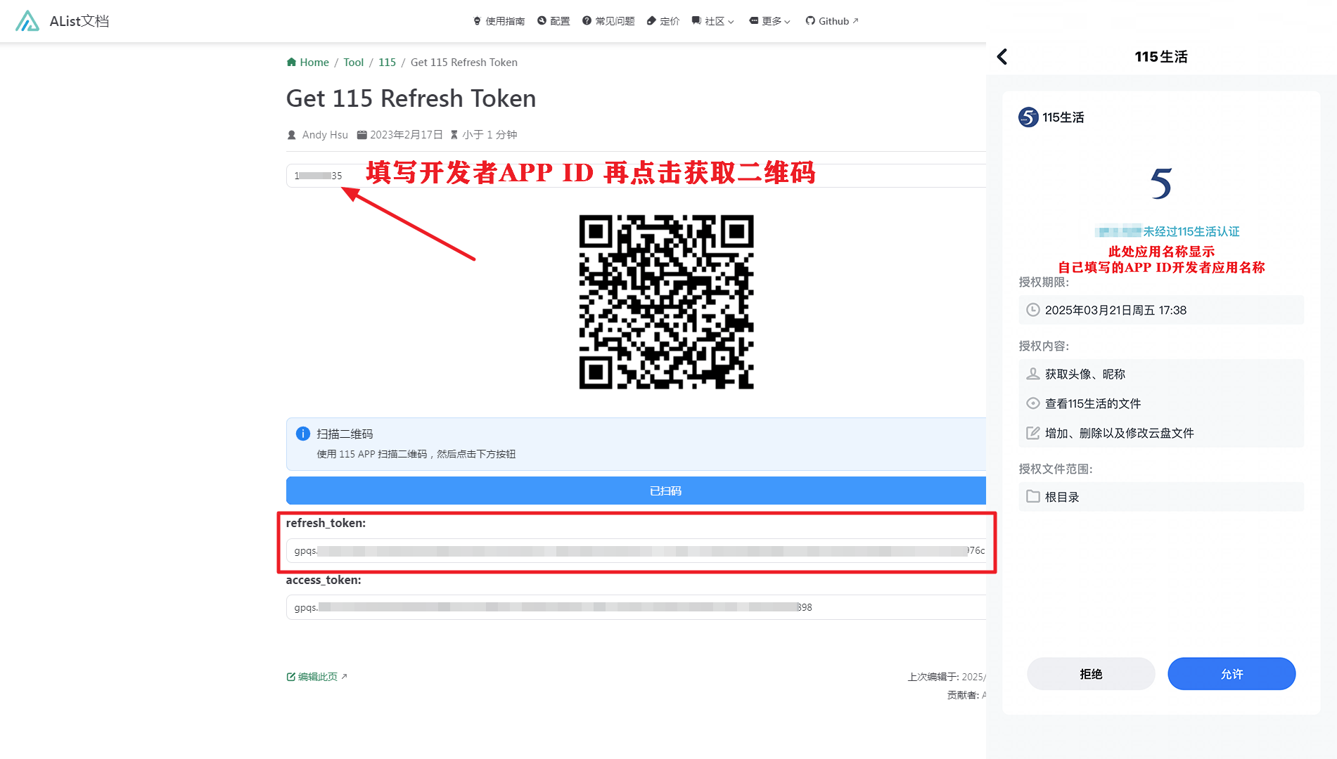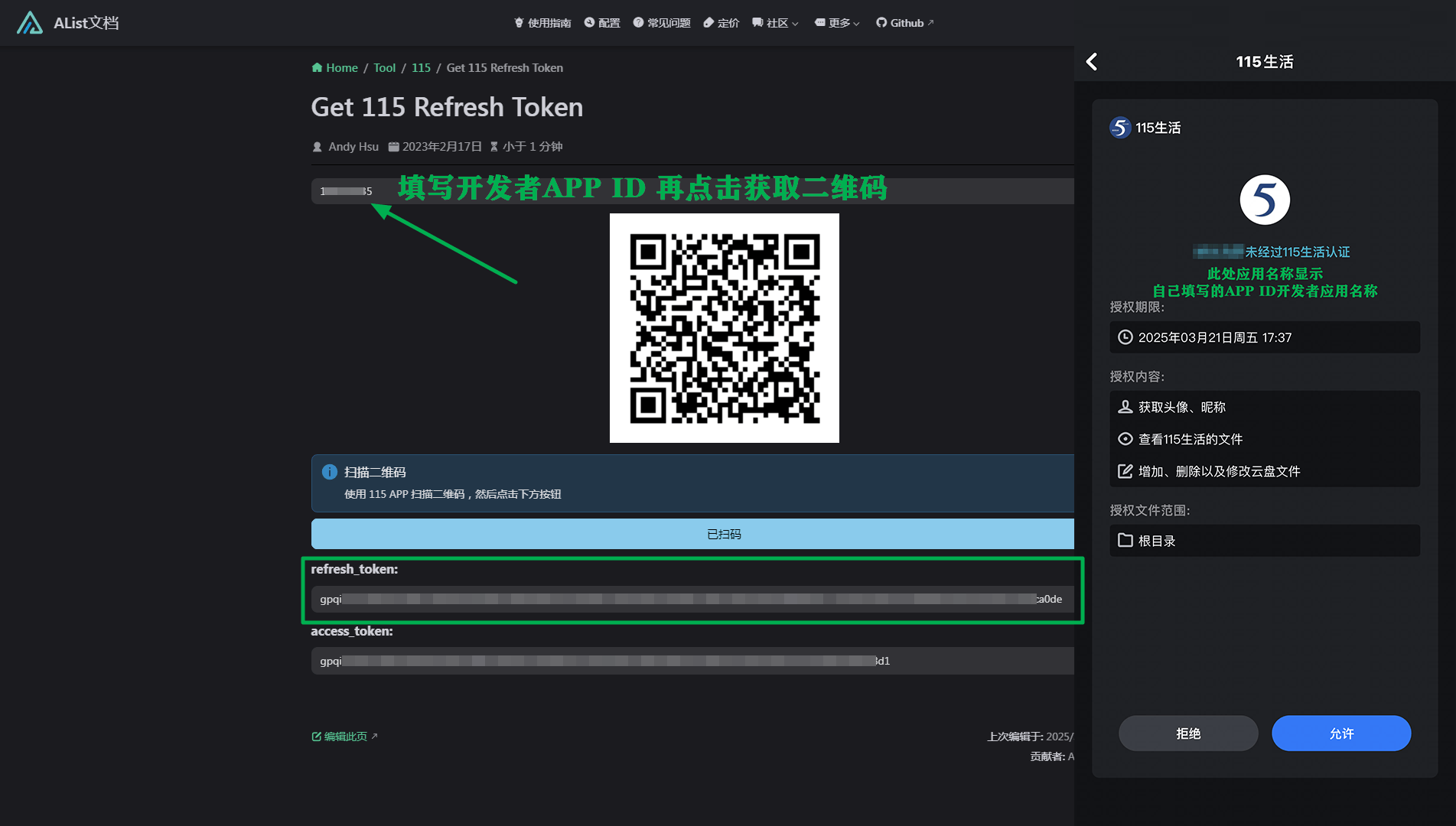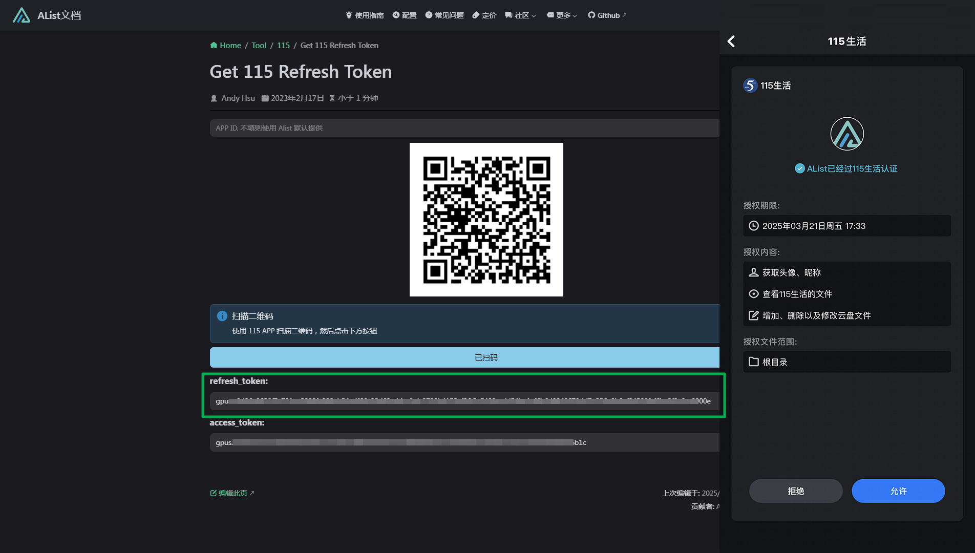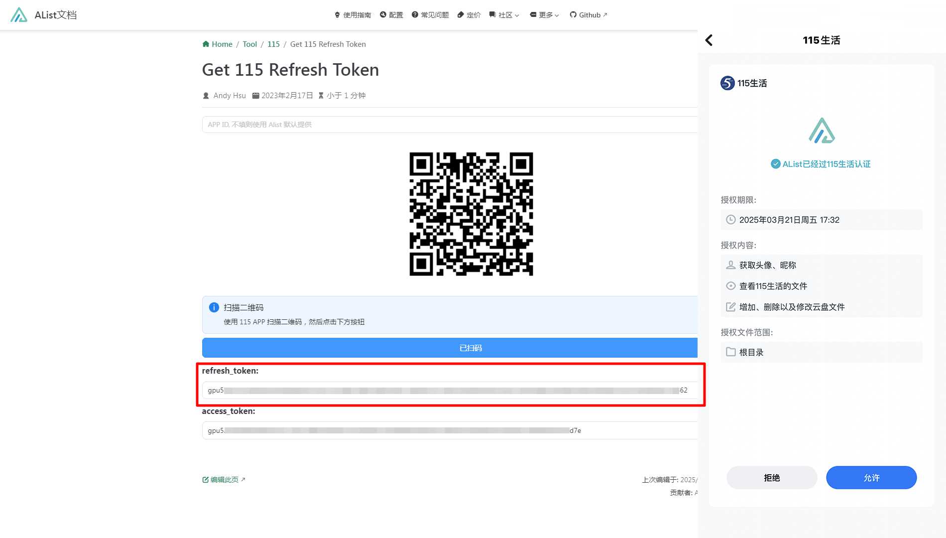 手机扫码后点击蓝色按钮即可获取 refresh token