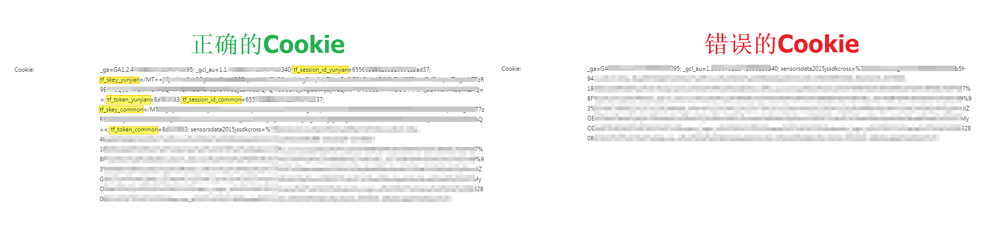 可以使用的Cookie是需要携带含有 tf_x 参数的Cookie,下图示例中左侧的可以使用,右侧的无法使用。